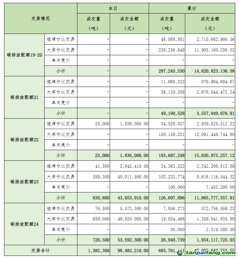 截至今日,全國(guó)碳排放權(quán)交易市場(chǎng)累計(jì)成交總量683,761,141噸,累計(jì)成交總額47,009,642,753.55元。 本文+內(nèi)-容-來(lái)-自;中^國(guó)_碳+排.放_(tái)交^易=網(wǎng) t a n pa ifa ng .c om