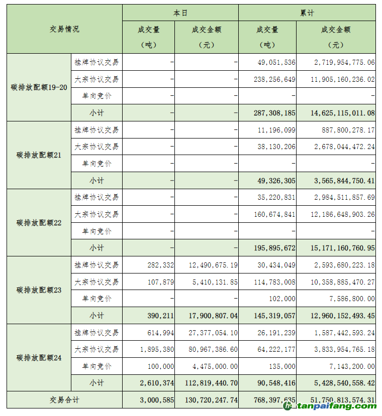 截至今日,全國(guó)碳排放權(quán)交易市場(chǎng)累計(jì)成交總量768,397,635噸,累計(jì)成交總額51,750,813,574.31元。 本*文@內(nèi)-容-來(lái)-自;中_國(guó)_碳^排-放*交-易^網(wǎng) t an pa i fa ng . c om