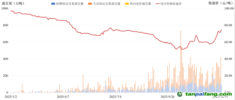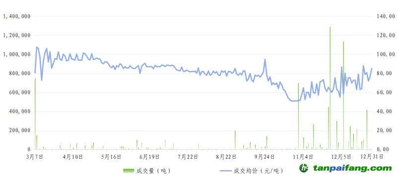 價(jià)格保持在合理區(qū)間,年底收盤價(jià)為74.63元/噸,全年交易均價(jià)為62.36元/噸。組織完成8場單向競價(jià),滿足市場多樣化交易需求。