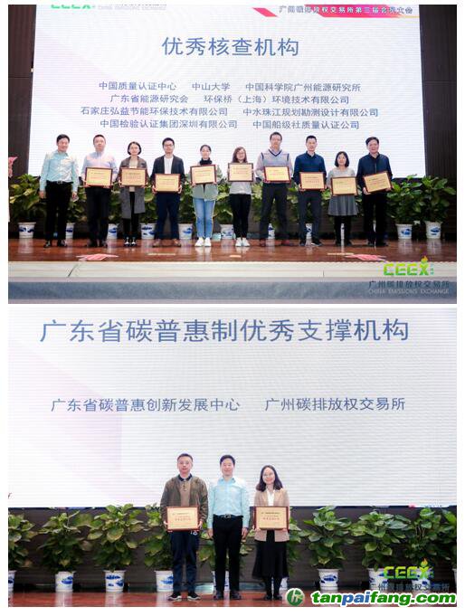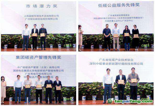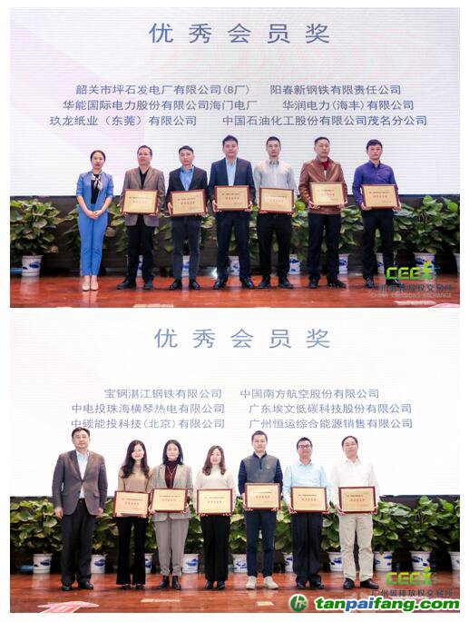 CCER交易績優(yōu)獎”;上海盈碳環(huán)境技術(shù)咨詢有限公司、廣州綠石碳科技股份有限公司榮獲“市場潛力獎”;廣東省低碳產(chǎn)業(yè)技術(shù)協(xié)會、深圳中碳事業(yè)新能源環(huán)境科技有限公司榮獲“會員開拓先鋒獎”;廣東省低碳發(fā)展促進(jìn)會、阿拉善SEE珠江項(xiàng)目中心、中國質(zhì)量認(rèn)證中心榮獲“低碳公益服務(wù)先鋒獎”;韶關(guān)市坪石發(fā)電廠有限公司(B)廠、陽春新鋼鐵有限責(zé)任公司、華能國際電力股份有限公司海門電廠、華潤電力(海豐)有限公司、玖龍紙業(yè)(東莞)有限公司、中國石油化工股份有限公司茂名分公司、寶鋼湛江鋼鐵有限公司、中國南方航空股份有限公司、中電投珠海橫琴熱電有限公司、廣東埃文低碳科技股份有限公司、中碳能投科技有限公司、廣州恒運(yùn)綜合能源銷售有限公司11家控排單位、5家非控排單位和5名個(gè)人會員獲選為廣碳所優(yōu)秀會員。微碳(廣州)低碳科技有限公司、北京太銘基業(yè)投資咨詢有限公司、柏能新能源(深圳)有限公司、國泰君安證券股份有限公司、碧辟(中國)投資有限公司獲頒最佳市場貢獻(xiàn)獎。