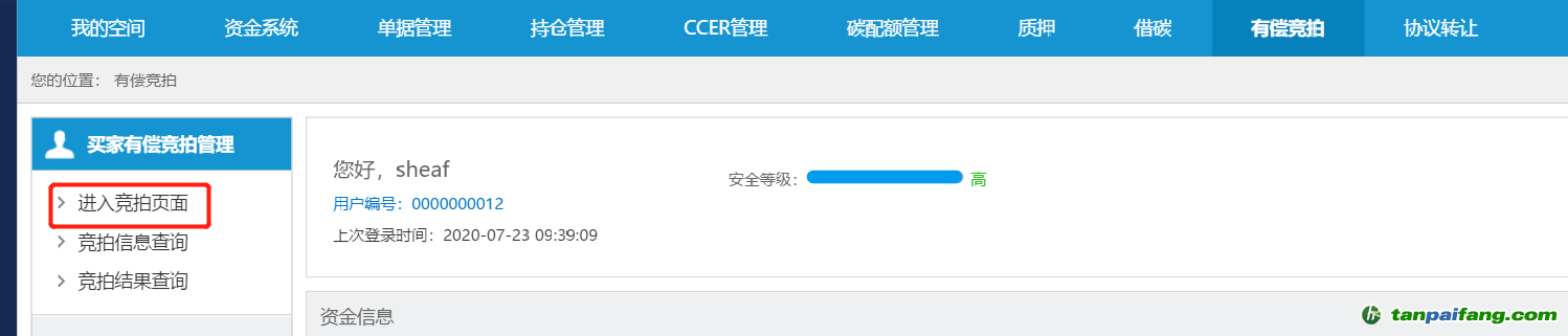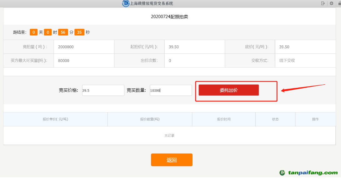 參與有償發(fā)放報(bào)價(jià)的用戶需要先在前臺(tái)客戶端-“有償競(jìng)拍-買家有償競(jìng)拍管理”進(jìn)行有償競(jìng)拍報(bào)名。 本`文內(nèi).容.來.自:中`國`碳`排*放*交*易^網(wǎng) t a npai fan g.com