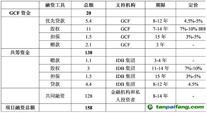 GCF和IDB集團(tuán)共出資3千萬(wàn)美元,撬動(dòng)1.28億美元的私人資金。從GCF的角度來(lái)說(shuō),出資2千萬(wàn),撬動(dòng)了1.38億美元,杠桿率為1:6.9。本項(xiàng)目各金融工具的具體用途如下: