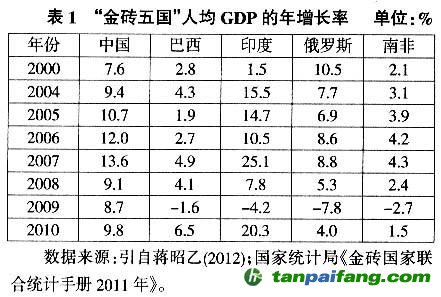 (1)金磚國家經(jīng)濟發(fā)展。總體來看,金磚國家經(jīng)濟潛力較大,經(jīng)濟發(fā)展較快。巴西經(jīng)濟位居拉美之首,同時是世界原料的重要基地;印度經(jīng)濟以年平均5.6%的速度增長了近20年,而且印度軟件業(yè)發(fā)達;俄羅斯擁有豐富的石油和天然氣資源,石油產(chǎn)業(yè)貢獻了俄羅斯50%的出口貿(mào)易產(chǎn)值和40%的國家收入;南非的工業(yè)產(chǎn)值占非洲的40%,消費能力占非洲的50%,GDP是整個非洲大陸GDP的25%。而中國作為世界第二大經(jīng)濟體,經(jīng)濟保持長期高速發(fā)展,2010年中國進出口總額已占世界的9.7%。