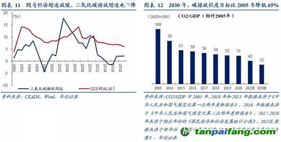 碳排放增速,既受經(jīng)濟增速影響,也受降低碳排放強度(單位GDP排放量)等目標持續(xù)實現(xiàn)的影響。2005年以后,我國經(jīng)濟增速中樞不斷下移,同時開始提出減排目標(2020年相比2005年碳排放強度降低40%-45%,2030年相比2005年碳排放強度降低65%以上),碳排放增速中樞不斷下移。十一五(2006-2010年)期間經(jīng)濟增速8.3%,碳排放年復合增速9.8%。十二五(2011-2015)期間經(jīng)濟增速7.9%,碳排放年復合增速2.7%。十三五(2016-2020年)期間經(jīng)濟增速6.7%,碳排放年復合增速1.3%。 本文@內(nèi)/容/來/自:中-國-碳^排-放-交易&*網(wǎng)-tan pai fang . com
