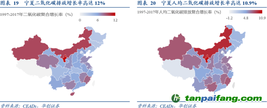 寧夏和內(nèi)蒙古是二氧化碳、人均二氧化碳年復合增長率最高的兩個省份。2017年,寧夏相對于1997年的二氧化碳、人均二氧化碳年復合增長率分別為12%和10.9%;內(nèi)蒙古相對于1997年的二氧化碳、人均二氧化碳年復合增長率分別為10%和9.4%。如果單獨要求各省控制碳排放增速,那么寧夏和內(nèi)蒙古等省市可能受到較大影響。