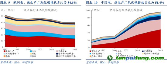 ?。ǘ┓中袠I(yè):據(jù)IEA統(tǒng)計,全球電力和熱力生產(chǎn)行業(yè)貢獻42%的二氧化碳排放,工業(yè)、交通運輸業(yè)分別貢獻為18.4%和24.6%。中國的情況是,電力和熱力生產(chǎn)行業(yè)貢獻51.4%,工業(yè)、交通運輸業(yè)分別貢獻27.9%、9.7%。中國碳排放來自電熱、工業(yè)的占比相比全球更高。