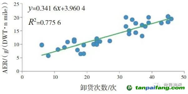 油輪在卸貨期間使用蒸汽驅(qū)動的貨油泵,鍋爐需要消耗大量的燃油,尤其是頻繁靠港的油輪。我國的一項研究分析了77艘油輪的AER值隨卸貨次數(shù)的變化關系,其中對4.2萬~5.2萬DWT油輪的分析如圖1所示。隨著卸貨次數(shù)的增加,船舶AER值明顯升高,船舶能效等級變差,甚至有可能進入E級。