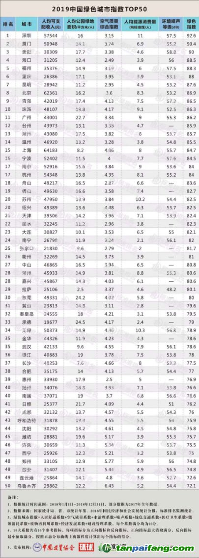 在《2019中國綠色城市指數(shù)TOP50》中,南方城市領(lǐng)跑綠色指數(shù),北方城市整體排名較為靠后,僅有北京、青島進(jìn)入前十。此外,城市的人均可支配收入差距較大,能源消耗也較大,空氣質(zhì)量得到了顯著提升,城市綠地面積仍需增加,有九成城市的環(huán)境噪聲等級超過50。 本`文-內(nèi).容.來.自:中`國^碳`排*放*交^易^網(wǎng) ta np ai fan g.com