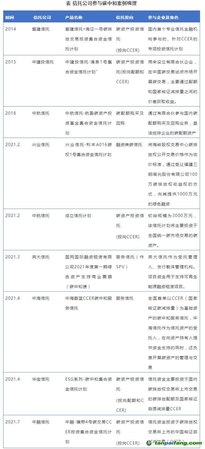 以華寶信托為例,今年4月,華寶信托成立“ESG系列-碳中和集合資金信托計(jì)劃”,信托資金主要投資于國(guó)內(nèi)碳排放權(quán)交易所上市交易的碳排放配額及國(guó)家核證自愿減排量CCER。 本文`內(nèi)-容-來(lái)-自;中_國(guó)_碳_交^易=網(wǎng) tan pa i fa ng . c om