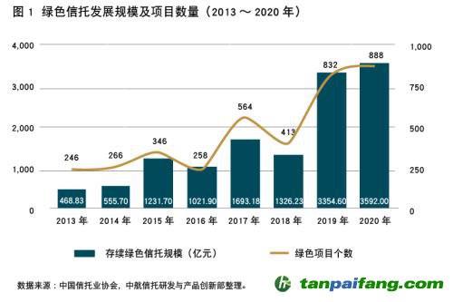 綠色信托的資產(chǎn)管理規(guī)模從2013年末的468.83億元快速增長(zhǎng)至2020年末的3592.82億元,同比增長(zhǎng)7.1%,新增規(guī)模為1199.93億元;存續(xù)項(xiàng)目數(shù)量為888個(gè),同比增長(zhǎng)6.73%,新增項(xiàng)目數(shù)量360個(gè)。這充分說(shuō)明綠色信托的經(jīng)濟(jì)價(jià)值、社會(huì)價(jià)值和環(huán)境價(jià)值愈發(fā)促成信托行業(yè)的共識(shí)和共建,成為信托行業(yè)服務(wù)實(shí)體經(jīng)濟(jì)的顯著本源業(yè)務(wù)。