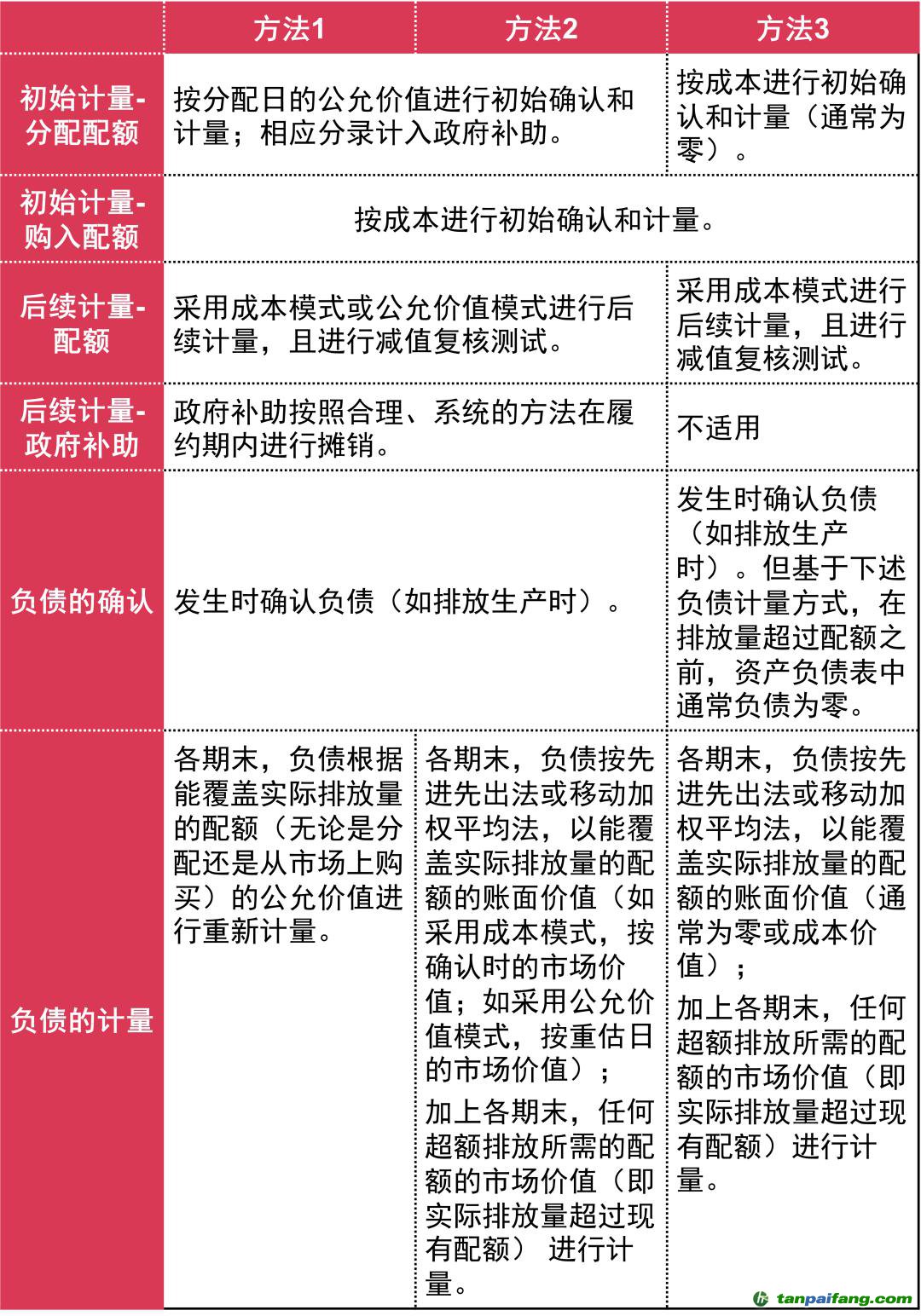 經(jīng)比較上述兩張表發(fā)現(xiàn),目前企業(yè)會計準則下的暫行規(guī)定接近于國際財務(wù)報告準則下的方法3(最簡單),但仍有很多不同之處,比如: 本`文-內(nèi).容.來.自:中`國^碳`排*放*交^易^網(wǎng) ta np ai fan g.com