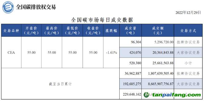 截至今日,全國碳市場(chǎng)碳排放配額(CEA)累計(jì)成交量229,648,162噸,累計(jì)成交額10,473,547,262.27元。
