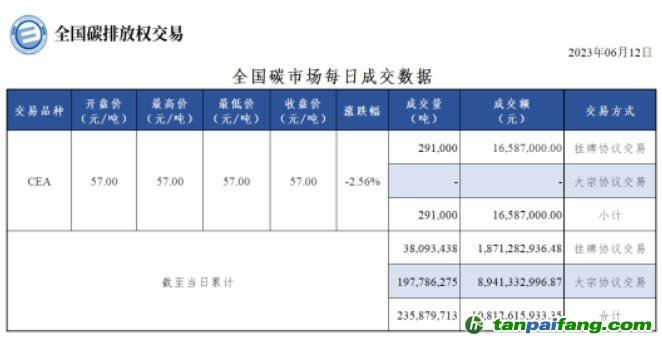 截至今日,全國(guó)碳市場(chǎng)碳排放配額(CEA)累計(jì)成交量235,879,713噸,累計(jì)成交額10,812,615,933.35元。