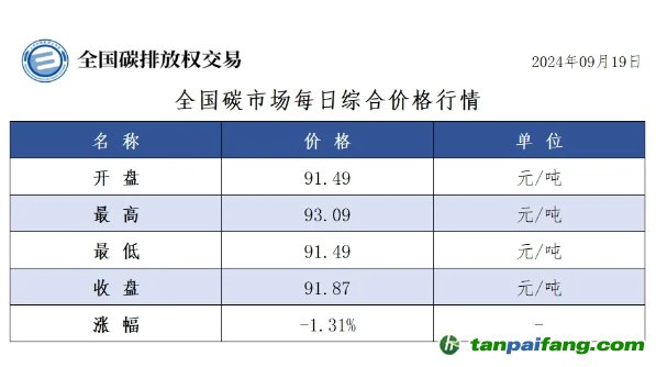 2024年1月1日至9月19日,全國(guó)碳市場(chǎng)碳排放配額成交量34,480,840噸,成交額3,035,842,815.52元。
