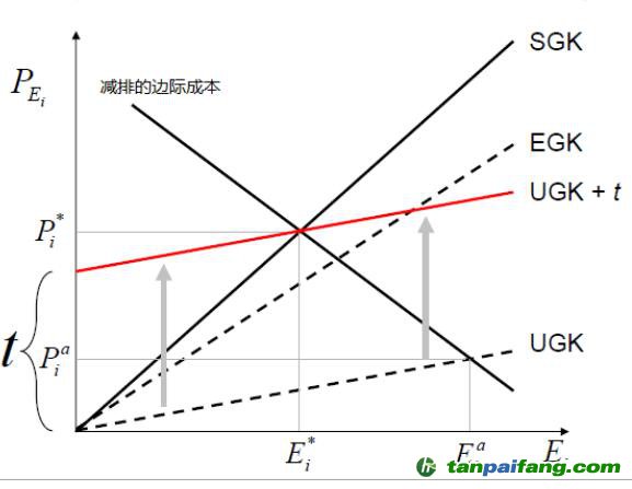 如果環(huán)境稅的設(shè)置(t)能夠正好彌補社會邊際損失(SGK)和造紙廠自身邊際損失(UGK)的差距,那么造紙廠福利最優(yōu)的排污量(Ei*)就等于社會福利最優(yōu)了。否則,出于自身利益的考慮,造紙廠會排放更多的污水(Eia)。