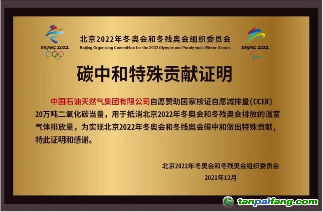 1月4日,中國石油收到了一份特殊“榮譽”——由北京冬奧組委頒發(fā)的“碳中和特殊貢獻證明”牌匾,因其自愿贊助20萬噸國家核證自愿減排量(