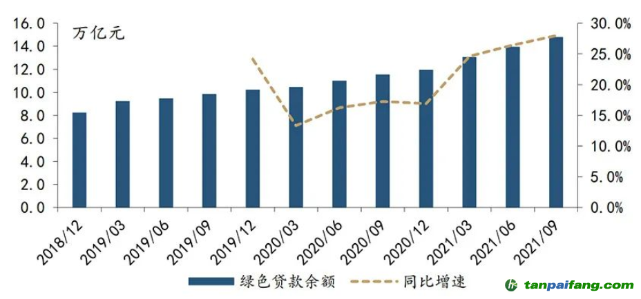 目前中國(guó)綠色信貸規(guī)模存量世界第一。截至2021年三季度末,中國(guó)本外幣綠色貸款余額14.78萬(wàn)億元,同比增長(zhǎng)27.9%,環(huán)比增長(zhǎng)1.4個(gè)百分點(diǎn)。其中,向直接和間接