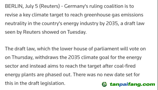 而仔細(xì)閱讀類似中文媒體報(bào)道,內(nèi)容大都來(lái)自于路透7月5日的報(bào)道《Draft law shows Germany plans to revise key emissions target for energy sector》。主要內(nèi)容見(jiàn)下圖:
