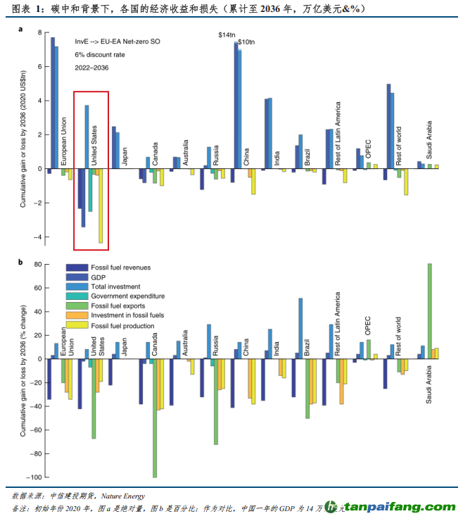 地緣政治緣何成為脫碳的絆腳石?在化石燃料時代,國家安全、軍事實(shí)力和政治權(quán)力與國家對化石燃料的控制密切相關(guān),有的國家本身擁有豐富的化石燃料儲量,有的國家則通過部署軍事力量來確保對海外石油的有效控制。依托化石燃料構(gòu)建的地緣政治格局,其本身就成為能源轉(zhuǎn)型的阻力,這種阻力來源于:在原有格局中的優(yōu)勢國家將因全球脫碳遭受巨額損失,見圖表1。