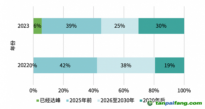 調(diào)研顯示,6%的專家認為中國電力行業(yè)碳排放已經(jīng)達峰,39%的專家認為2025年前可達峰,25%支持達峰時間在2026-2030年,剩余30%的專家則認為達峰時間在2030年后。