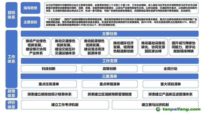 以習(xí)近平新時(shí)代中國(guó)特色社會(huì)主義思想為指導(dǎo),全面貫徹黨的二十大和二十屆二中、三中、四中全會(huì)精神,深入落實(shí)習(xí)近平生態(tài)文明思想和習(xí)近平總書記視察重慶重要講話重要指示精神,完整準(zhǔn)確全面貫徹新發(fā)展理念,以深化產(chǎn)業(yè)綠色轉(zhuǎn)型為主線,以優(yōu)化能源、交通結(jié)構(gòu)為重點(diǎn),以低碳科技創(chuàng)新為支撐,扎實(shí)做好園區(qū)碳達(dá)峰試點(diǎn)工作。“十五五”期間,園區(qū)產(chǎn)業(yè)結(jié)構(gòu)調(diào)整優(yōu)化取得明顯進(jìn)展,清潔高效能源體系與交能互補(bǔ)交通運(yùn)輸體系基本建成,重點(diǎn)行業(yè)綠色低碳技術(shù)研發(fā)和推廣應(yīng)用取得新進(jìn)展,綠色低碳循環(huán)發(fā)展體系基本健全,形成多維支撐達(dá)峰的現(xiàn)代化發(fā)展格局。到2030年,非化石能源消費(fèi)占比提高至22%,單位工業(yè)增加值二氧化碳排放量降低至0.95噸/萬(wàn)元以下,努力實(shí)現(xiàn)碳達(dá)峰。 本`文內(nèi).容.來(lái).自:中`國(guó)`碳`排*放*交*易^網(wǎng) t a npai fan g.com