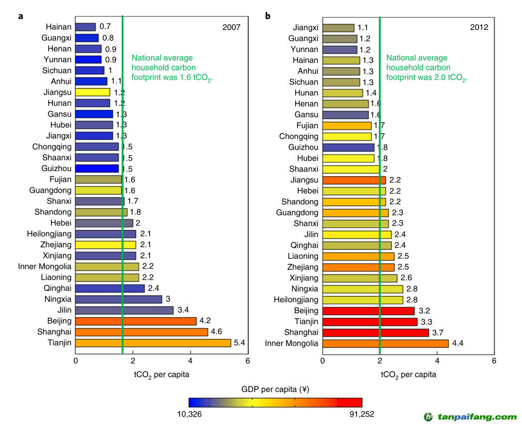 圖1. 各省份人均碳足跡:a-2007年,b- 2012年