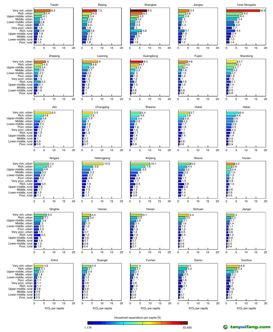 圖2. 2012年各省份12個(gè)收入群體的人均碳足跡