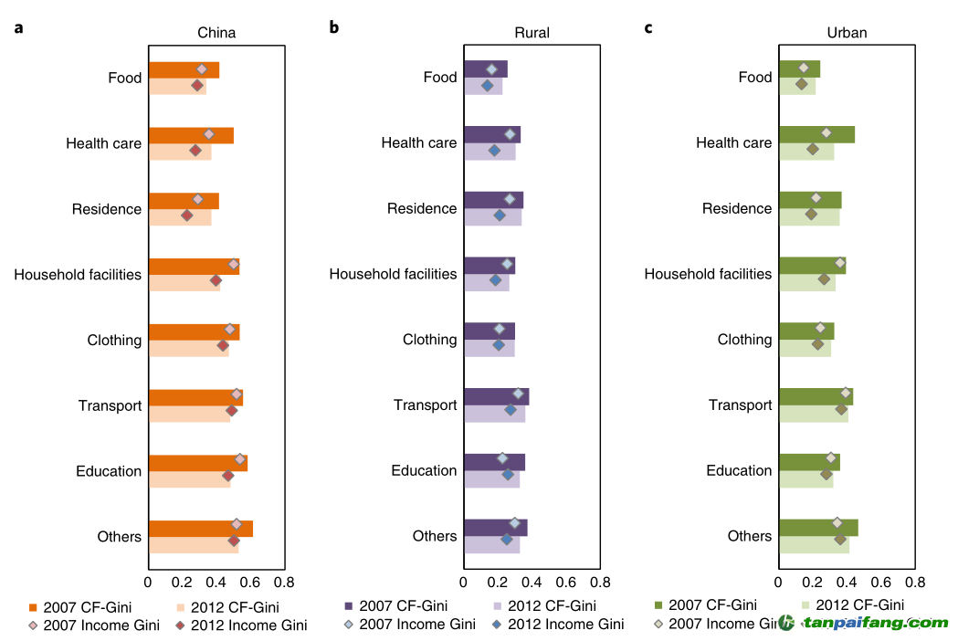 研究也發(fā)現(xiàn),中國(guó)經(jīng)濟(jì)增長(zhǎng)有利于促進(jìn)家庭碳足跡的公平性。從縱向時(shí)間跨度看,中國(guó)碳足跡基尼系數(shù)(該系數(shù)越小意味著越平等)從2007年的0.44下降到2012年的0.37。從橫向空間視角看,富裕地區(qū)的家庭碳足跡公平性相對(duì)較高。例如,2012年,天津、北京、上海和江蘇的人均GDP均超6.8萬,其碳足跡基尼系數(shù)也相對(duì)較低,分別為0.19、0.16、0.14和0.18。相反地,欠發(fā)達(dá)地區(qū)的碳足跡基尼系數(shù)相對(duì)較高。例如,貴州的碳足跡基尼系數(shù)為0.38。 本+文`內(nèi).容.來.自:中`國(guó)`碳`排*放*交*易^網(wǎng) t a np ai fan g.com
