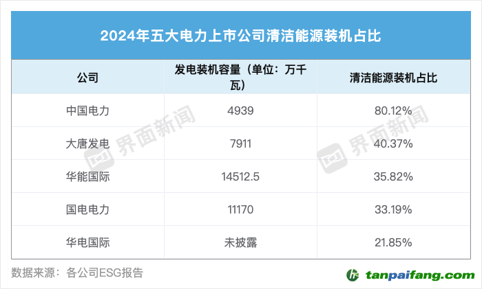 五家公司中,中國電力的清潔能源占比最高,達(dá)到80.12%。華電國際未在ESG報告披露該數(shù)據(jù),界面新聞查閱該公司2024年財報,其清潔能源發(fā)電裝機(jī)約占21.85%。 本文@內(nèi)/容/來/自:中-國-碳^排-放-交易&*網(wǎng)-tan pai fang . com