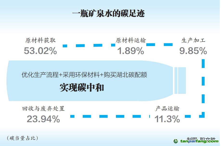 報告顯示:每生產(chǎn)一瓶550毫升的礦泉水,需要經(jīng)過原材料獲取、原材料運輸、生產(chǎn)加工、產(chǎn)品運輸以及回收與廢棄處置五個關(guān)鍵環(huán)節(jié),共產(chǎn)生碳足跡總值為232.4克二氧化碳當量。其中,原材料獲取階段的碳排放量,約占碳足跡總值的一半;回收與廢棄處置階段,約占碳足跡總值的1/4,這進一步說明礦泉水瓶的回收利用及廢棄物處理面臨很大的環(huán)保壓力。 夲呅內(nèi)傛萊源?。骇鎲┨?排*放^鮫*易-網(wǎng) τā ńpāīfāńɡ.cōm