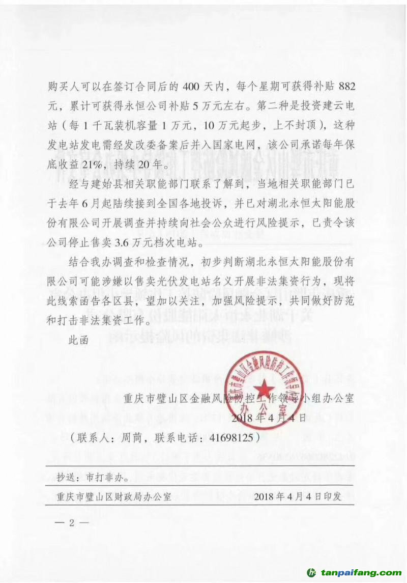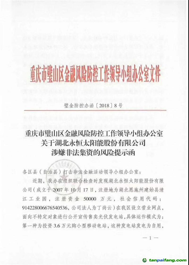 2018年4月4日,重慶市璧山區(qū)金融風(fēng)險(xiǎn)防控工作領(lǐng)導(dǎo)小組辦公室發(fā)布了關(guān)于湖北永恒太陽(yáng)能股份有限公司涉嫌非法集資的風(fēng)險(xiǎn)提示函。