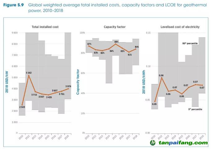 國(guó)際可再生能源署發(fā)布最新的可再生能源發(fā)電成本報(bào)告,2010-2018年全球地?zé)岚l(fā)電項(xiàng)目加權(quán)平均的單位投資成本、容量系數(shù)、平準(zhǔn)化成本