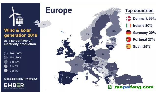 歐盟28國的風(fēng)能和太陽能占發(fā)電比例高達(dá)18%,是全球平均水平的兩倍多。丹麥?zhǔn)穷I(lǐng)頭羊,其55%的電力來自風(fēng)能和太陽能,2019年增長了7個百分點。愛爾蘭、德國、葡萄牙、西班牙也分別以30%、29%、27%、25%高于歐洲平均水平。然而,有些國家仍然遠(yuǎn)遠(yuǎn)落后。塞爾維亞(0%)、斯洛伐克(2%)和斯洛文尼亞(2%)風(fēng)能和太陽能占比依然非常低。