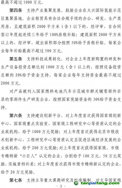 第四條支持企業(yè)聚集發(fā)展。鼓勵(lì)企業(yè)在大興國際氫能示范區(qū)集聚落地。企業(yè)租賃具有合法合規(guī)手續(xù)的辦公、研發(fā)、生產(chǎn)類用房,且建筑面積2000平米(含)以下的,經(jīng)評審,自合同簽訂年度起連續(xù)三年給予100%房租補(bǔ)貼;建筑面積2000平米以上的,經(jīng)評審,超出面積部分按照50%給予房租補(bǔ)貼。每家企業(yè)每年補(bǔ)貼最高不超過500萬元。 本+文`內(nèi)/容/來/自:中-國-碳-排-放-網(wǎng)-tan pai fang . com