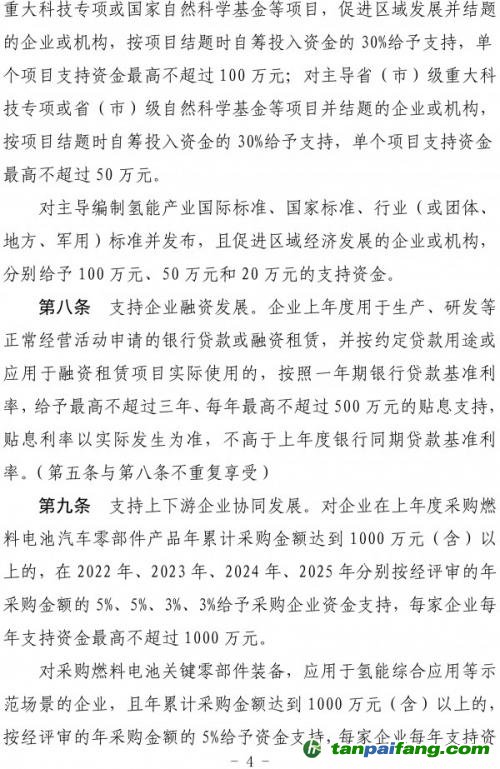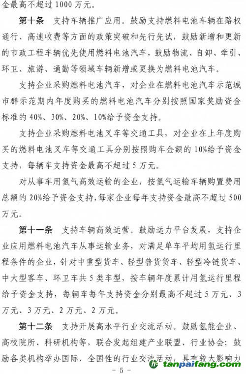 第九條支持上下游企業(yè)協(xié)同發(fā)展。對企業(yè)在上年度采購燃料電池汽車零部件產(chǎn)品年累計(jì)采購金額達(dá)到1000萬元(含)以上的,在2022年、2023年、2024年、2025年分別按經(jīng)評審的年采購金額的5%、5%、3%、3%給予采購企業(yè)資金支持,每家企業(yè)每年支持資金最高不超過1000萬元。 禸嫆@唻洎:狆國湠棑倣茭昜蛧 τāńpāīfāńɡ.cōm