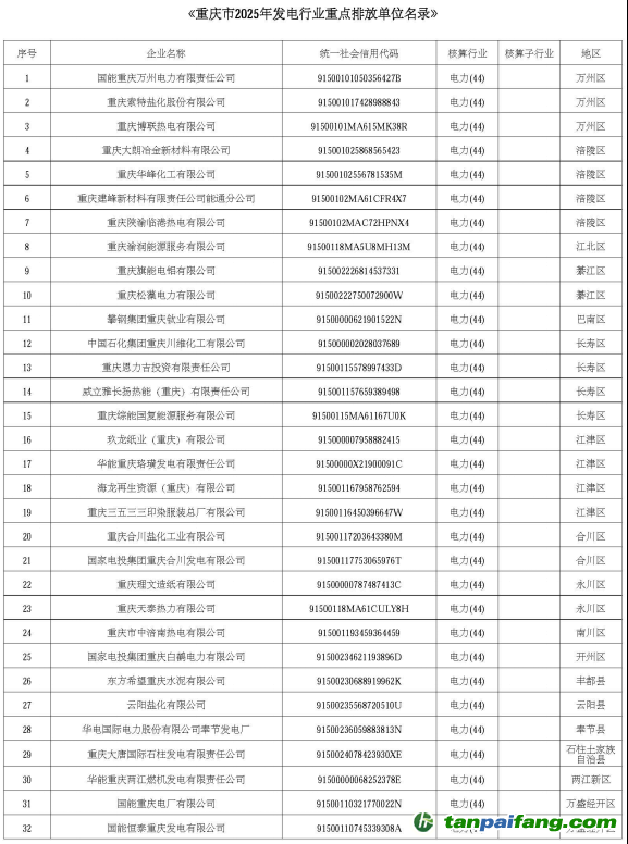 附件:重慶市2025年發(fā)電行業(yè)重點(diǎn)排放單位名錄